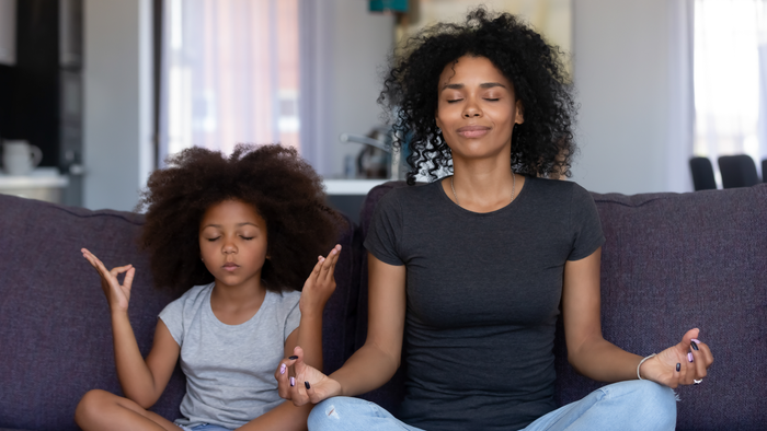 Explain the what, why, and how of the practice so they understand the process, and so they can share how it’s going for them, too. As you navigate what this looks like for your family, decide together if you’ll do a number of activities switching off on days (like belly breathing one day and meditation apps on another), or if you want to try a little bit of everything. Determine if there’s a set time of day or recurrence you’re aiming for and for how long. A good place to start is once a day for 15-30 minutes when everyone is awake and alert, like early in the morning together or an hour before bed.