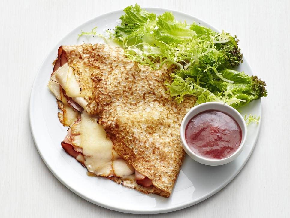 A raspberry mustard and side salad make an excellent accompaniment to these cheesy, meaty monte cristo crepes.