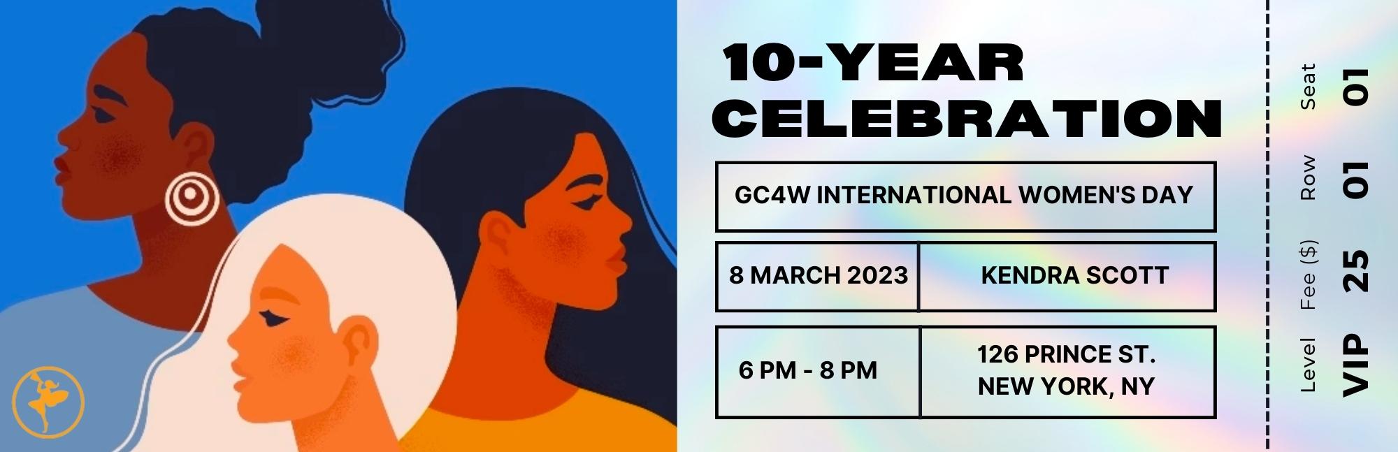 Happy Almost Women’s History Month! Your special invitation to the annual GC4W International Women’s Day Celebration: A 10-Year Celebration Exclusive has Arrived. We hope you are equally excited to celebrate with us as we reach a new milestone of a decade of recognizing the outstanding contributions of women in our global society and amplifying the need for sustainable equity and inclusive growth. This special 10-Year Celebration is also an incredible opportunity to celebrate, reconnect, toast, and interact as we foster continuity in a post-pandemic world. We are grateful to Kendra Scott and her team for their partnership and support in celebrating this milestone with you and the rest of our Community.